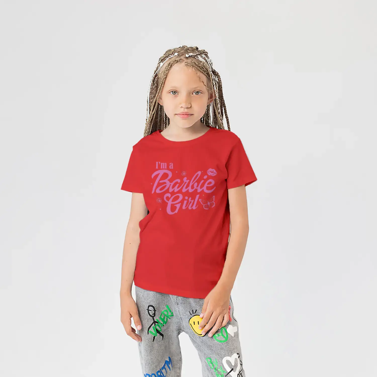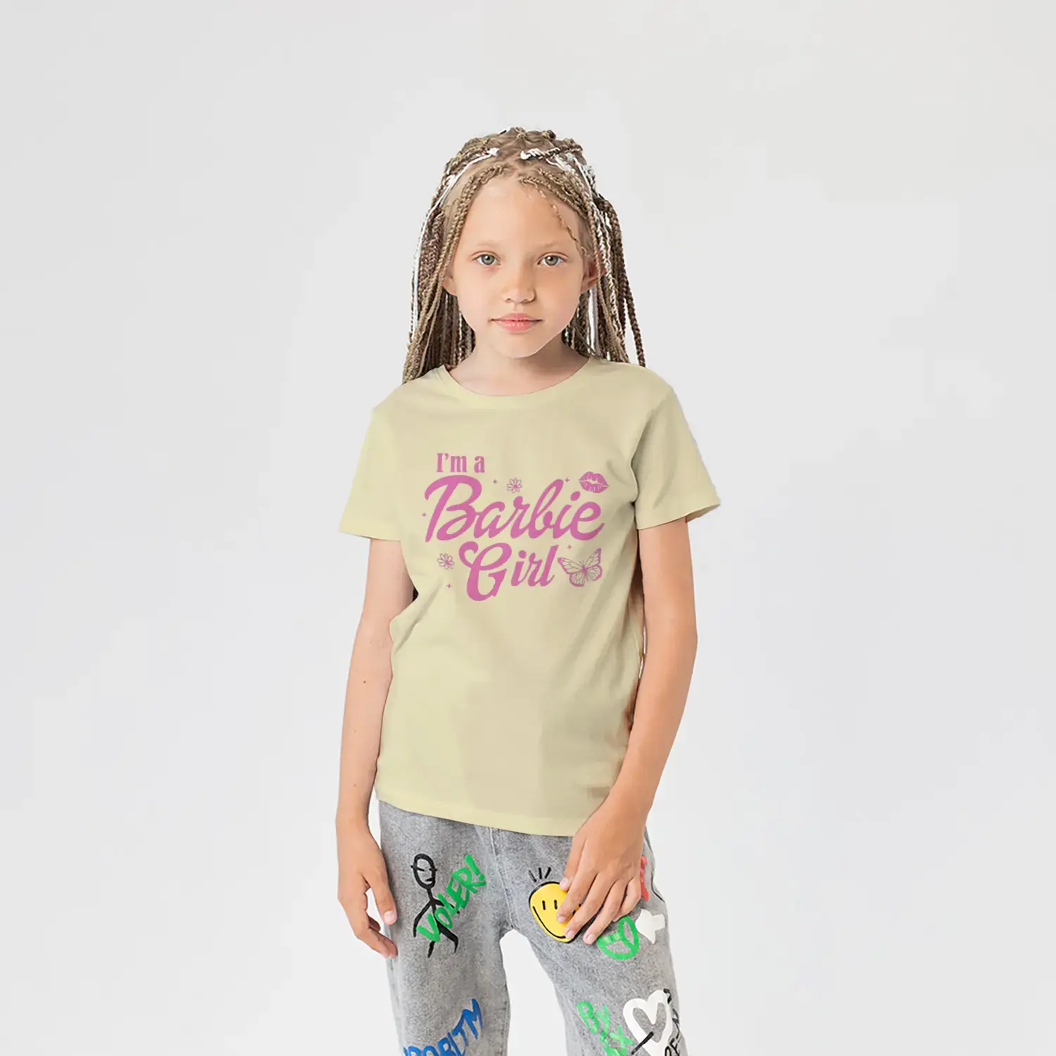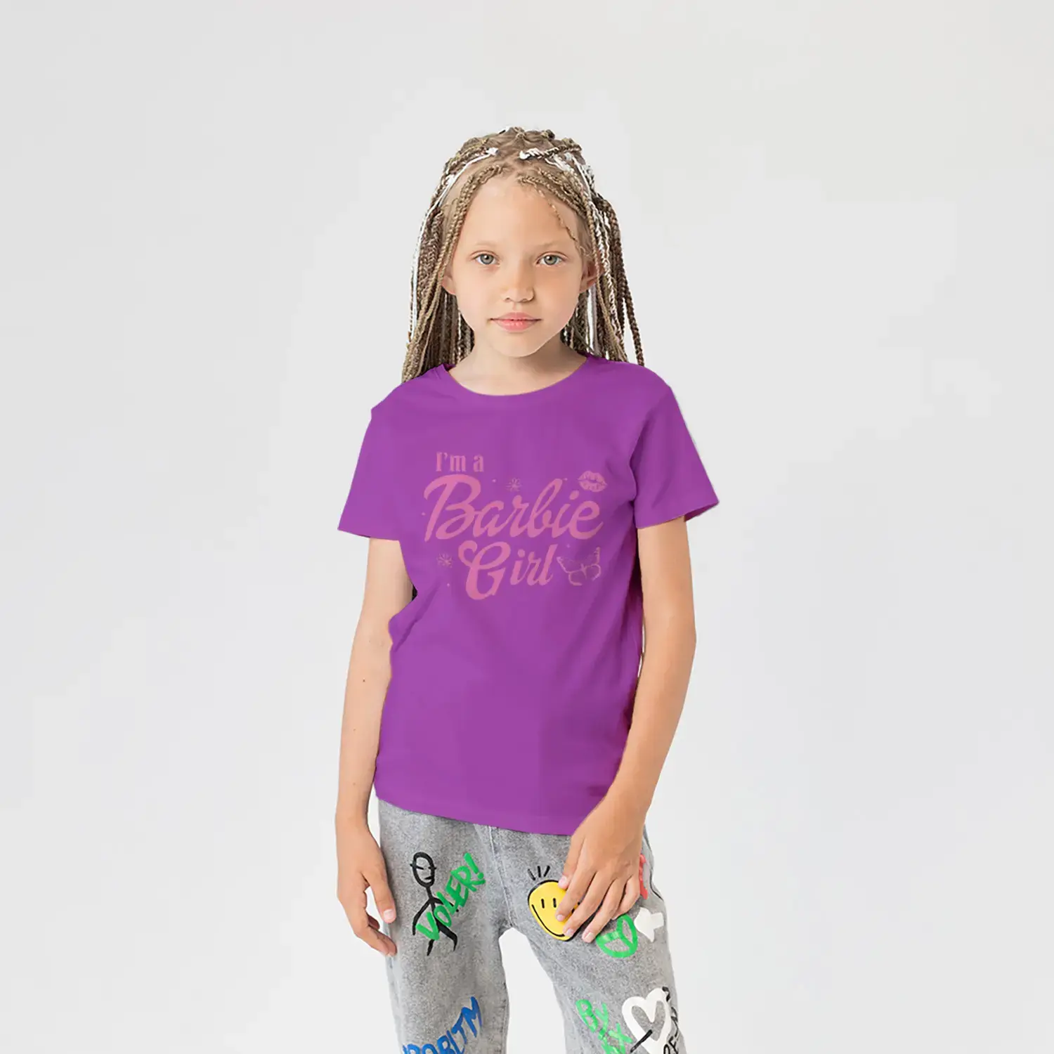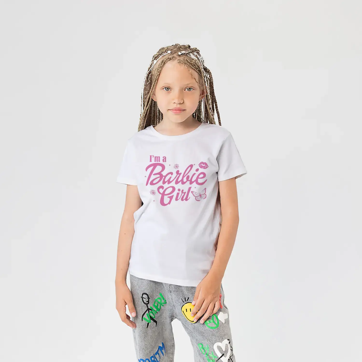 Pembe Kelebek ve Çiçek Süslemeli Moda Kız Yazı Baskılı Kız Çocuk