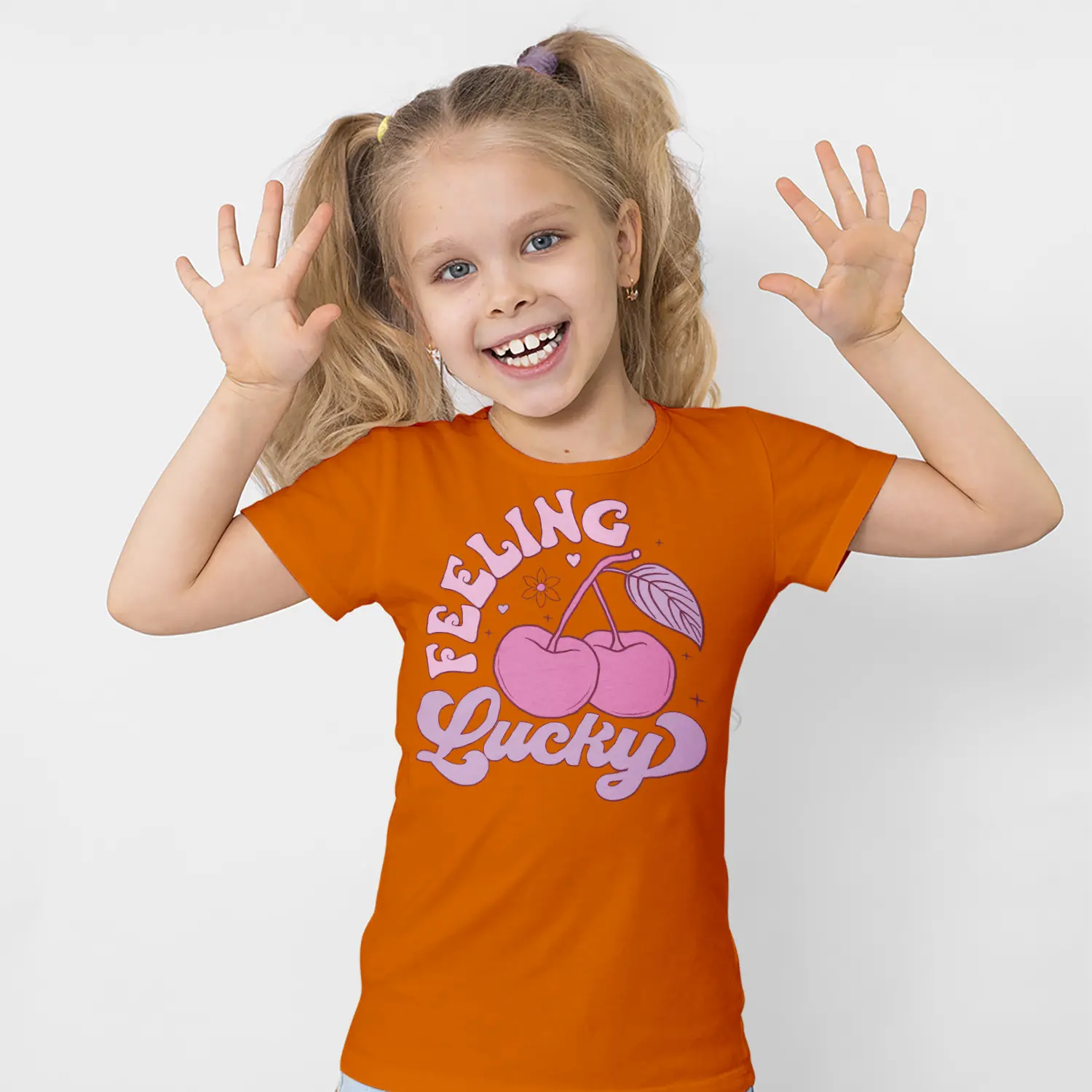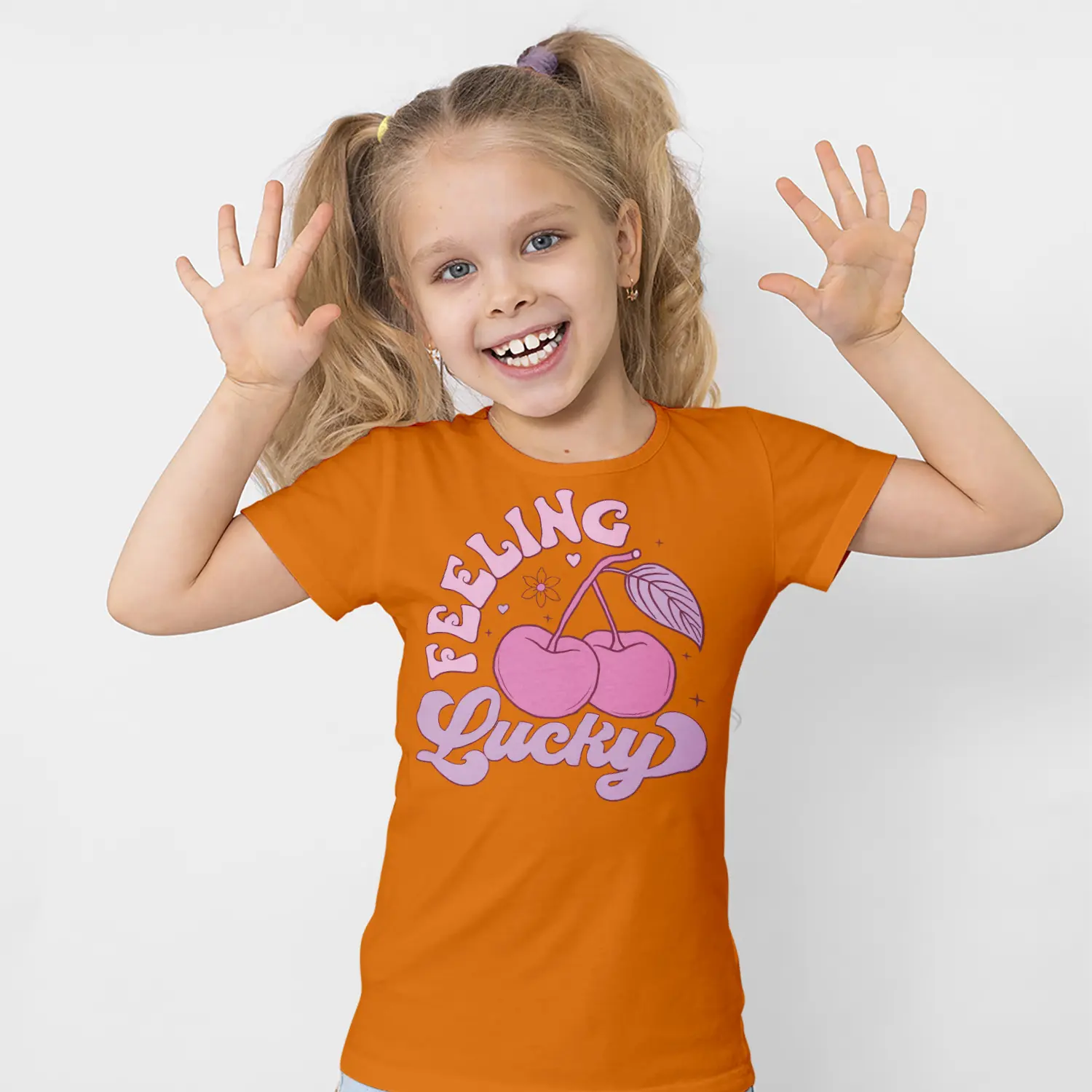 Pembe Kiraz ve Feeling Lucky Yazılı Baskılı Kız Çocuk Tişörtü