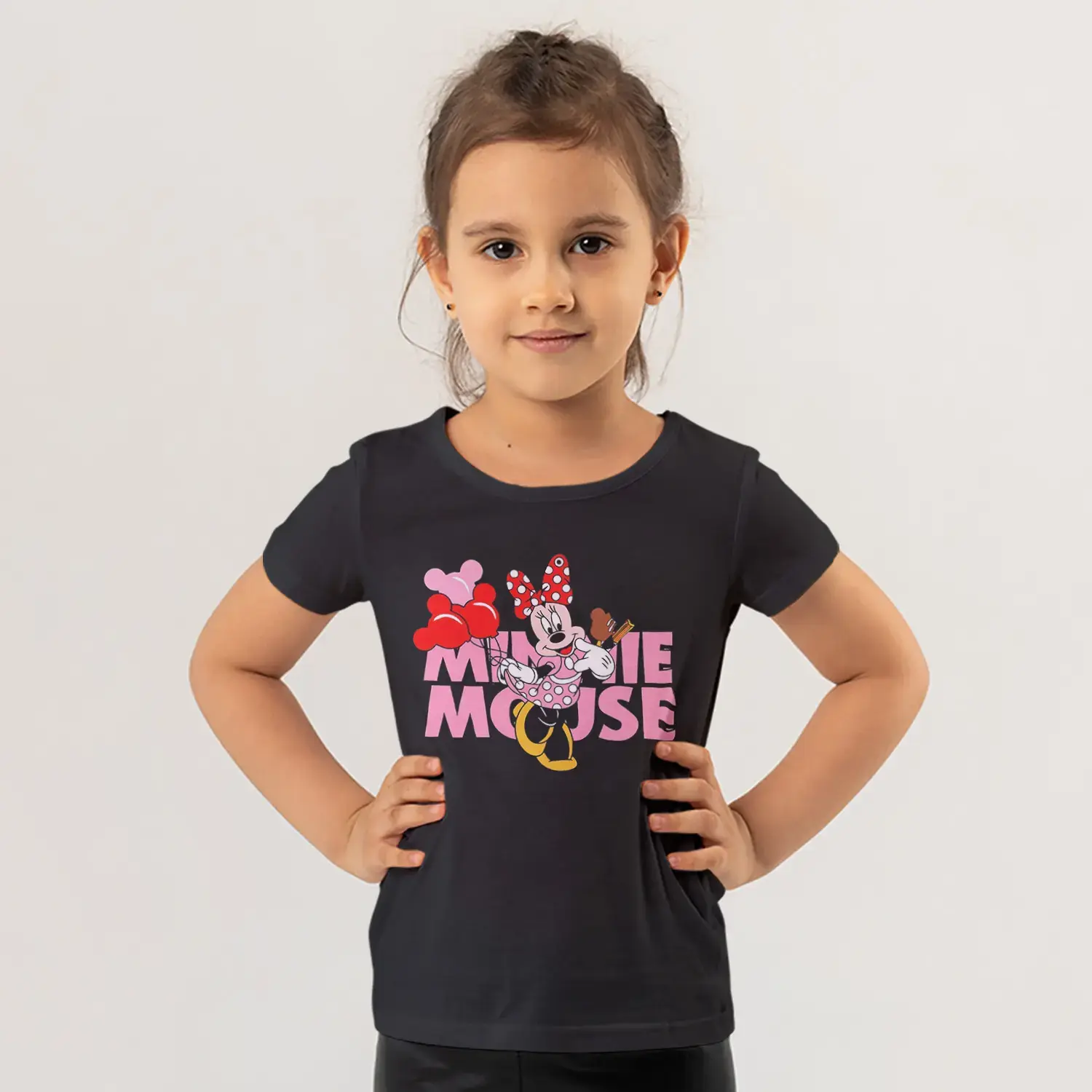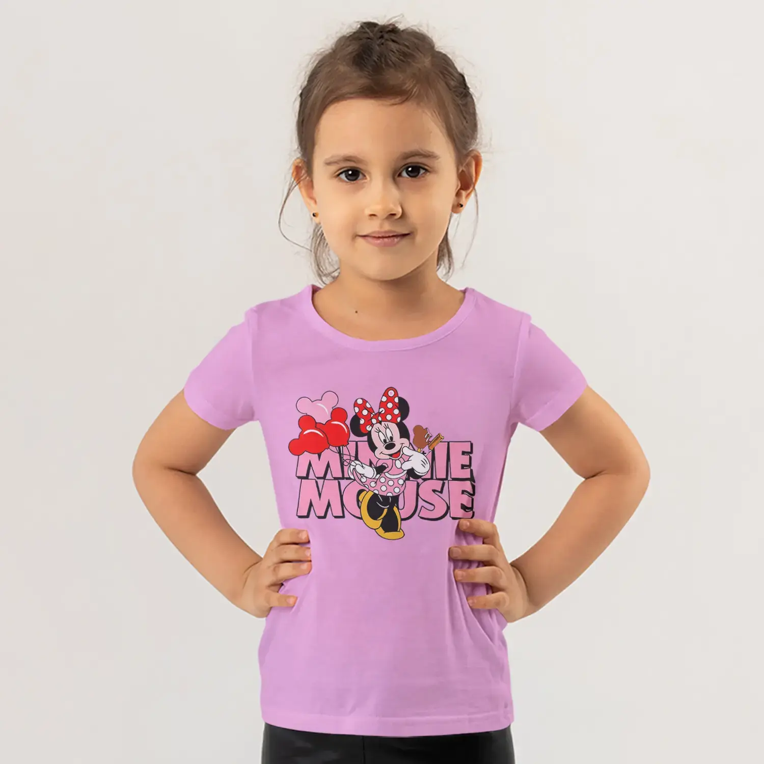 Pembe Puantiyeli Elbiseli Fare Kız Balon Tutuyor Pembe Yazılı Baskılı Kız Çocuk Tişörtü