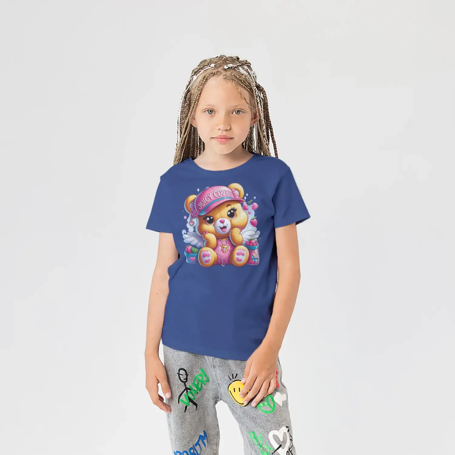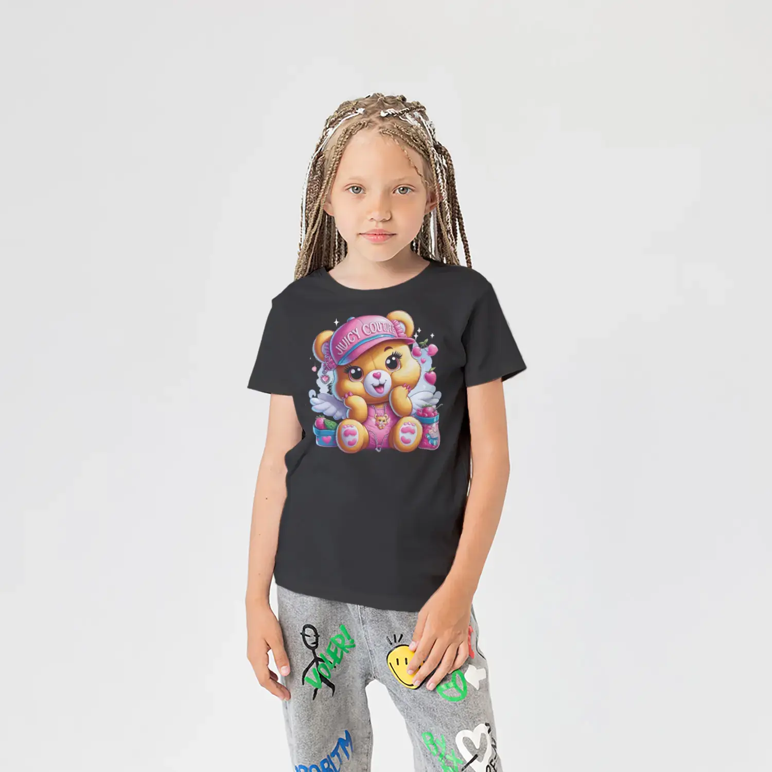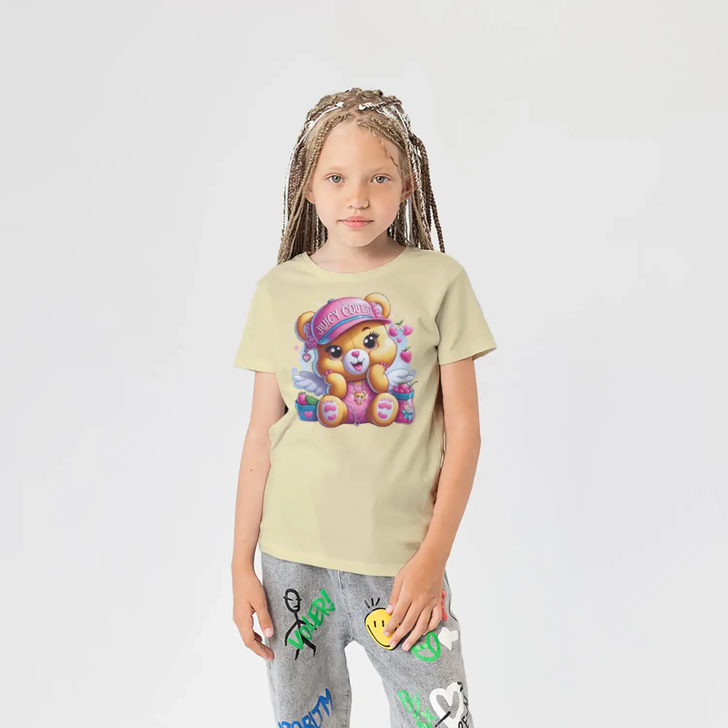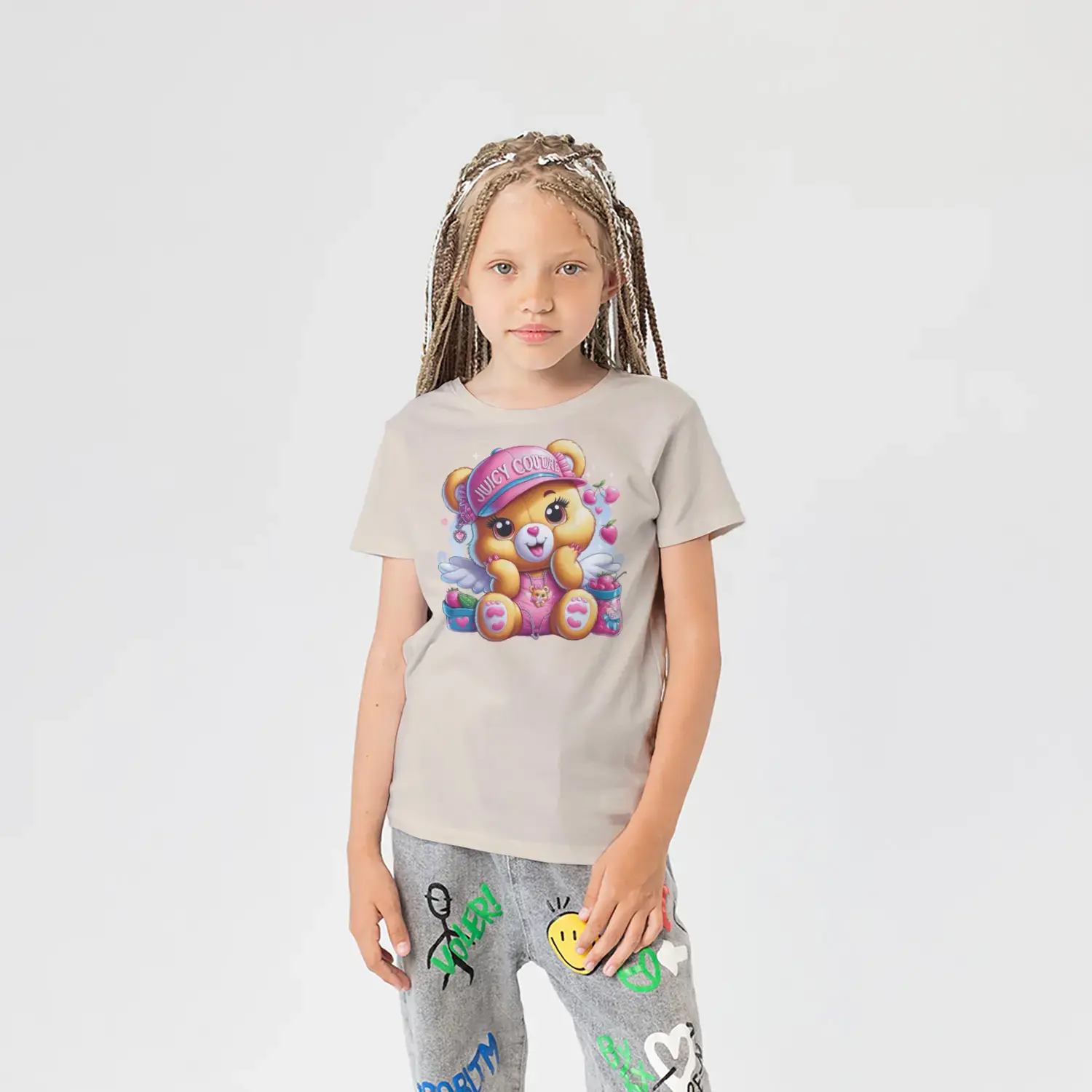 Pembe Şapkalı Tatlı Ayıcık Melek Kanatlı Baskılı Kız Çocuk Tişörtü