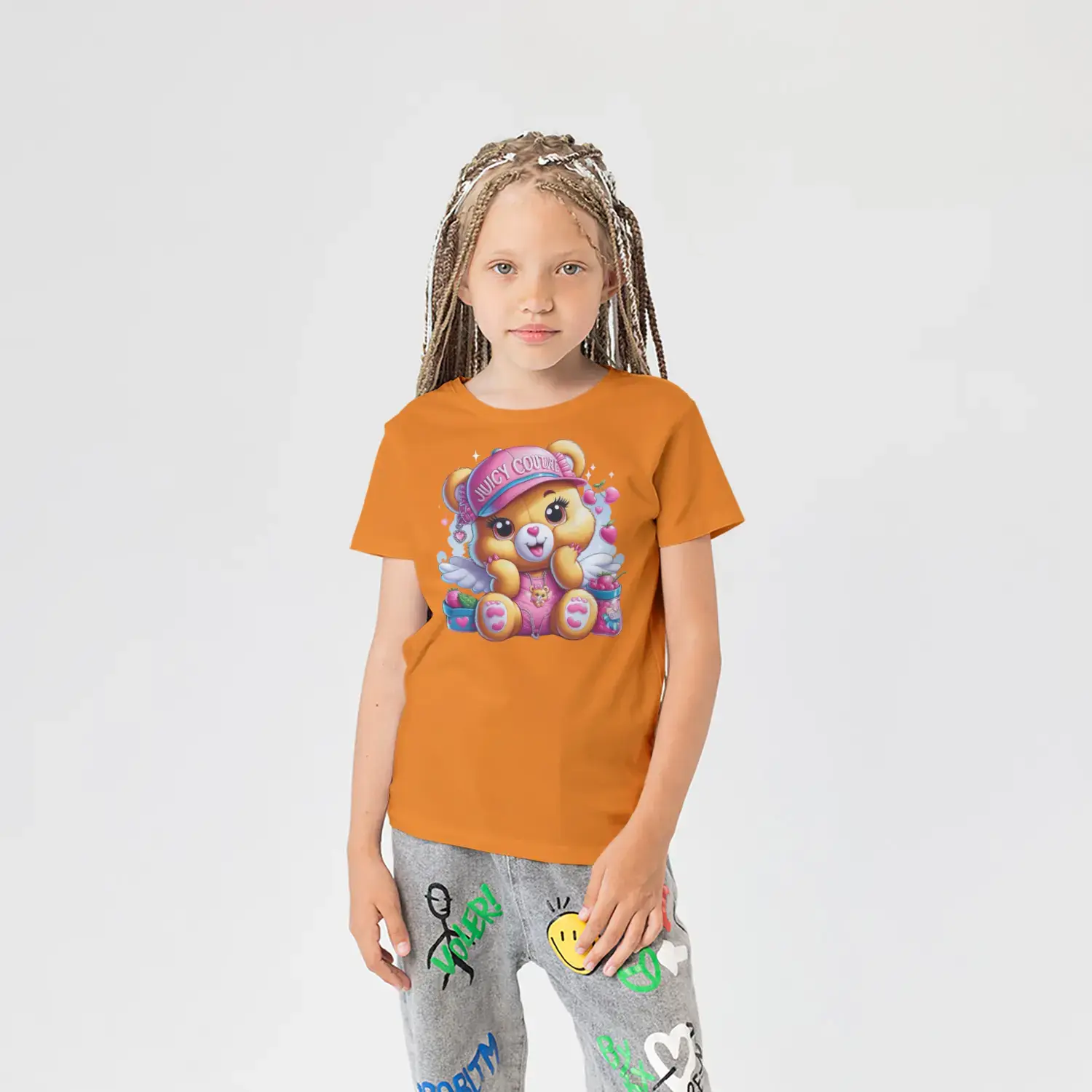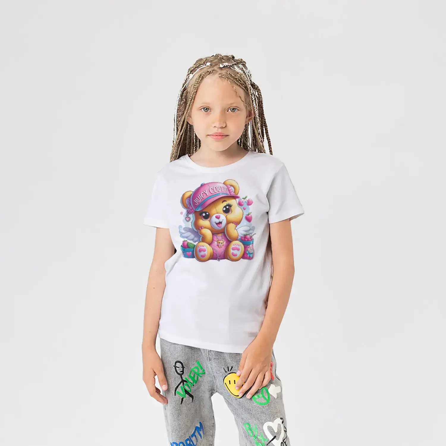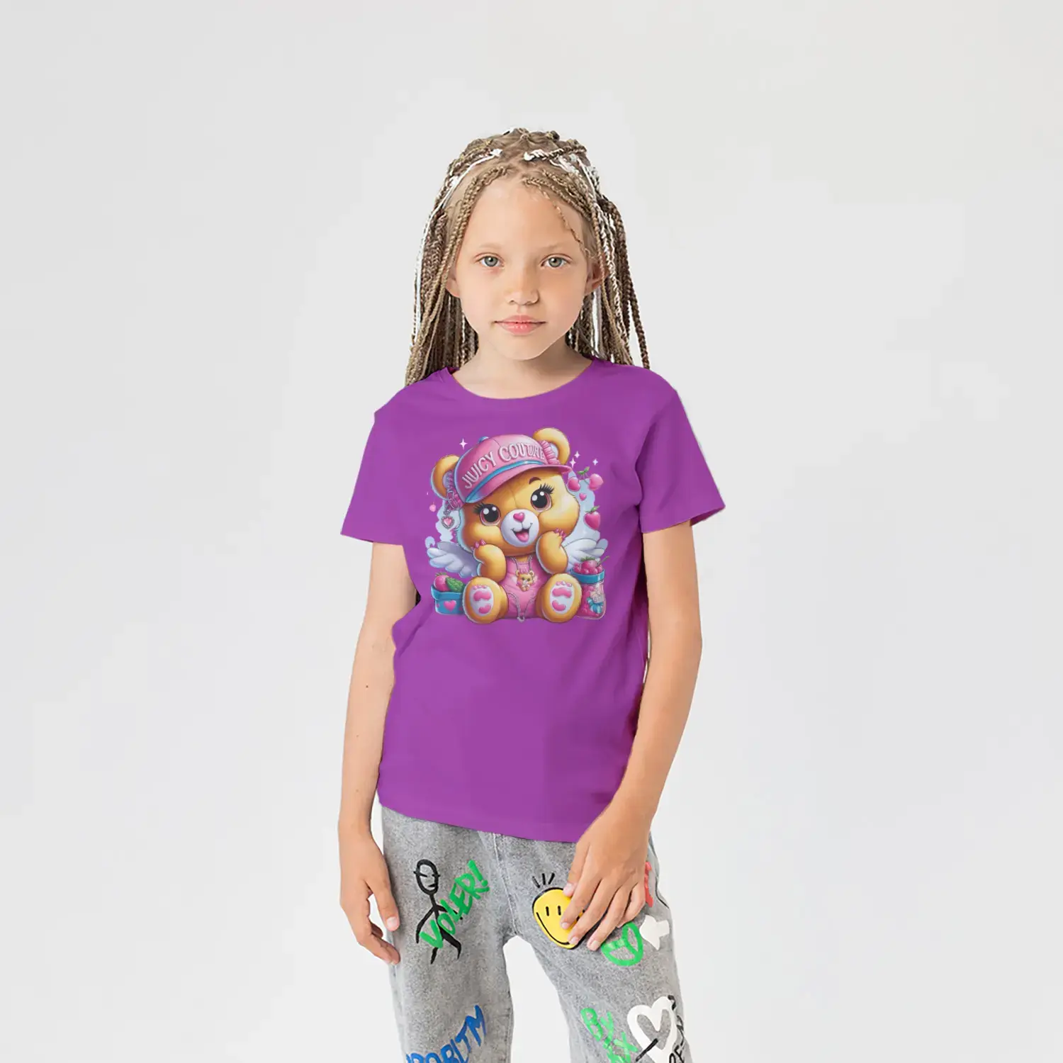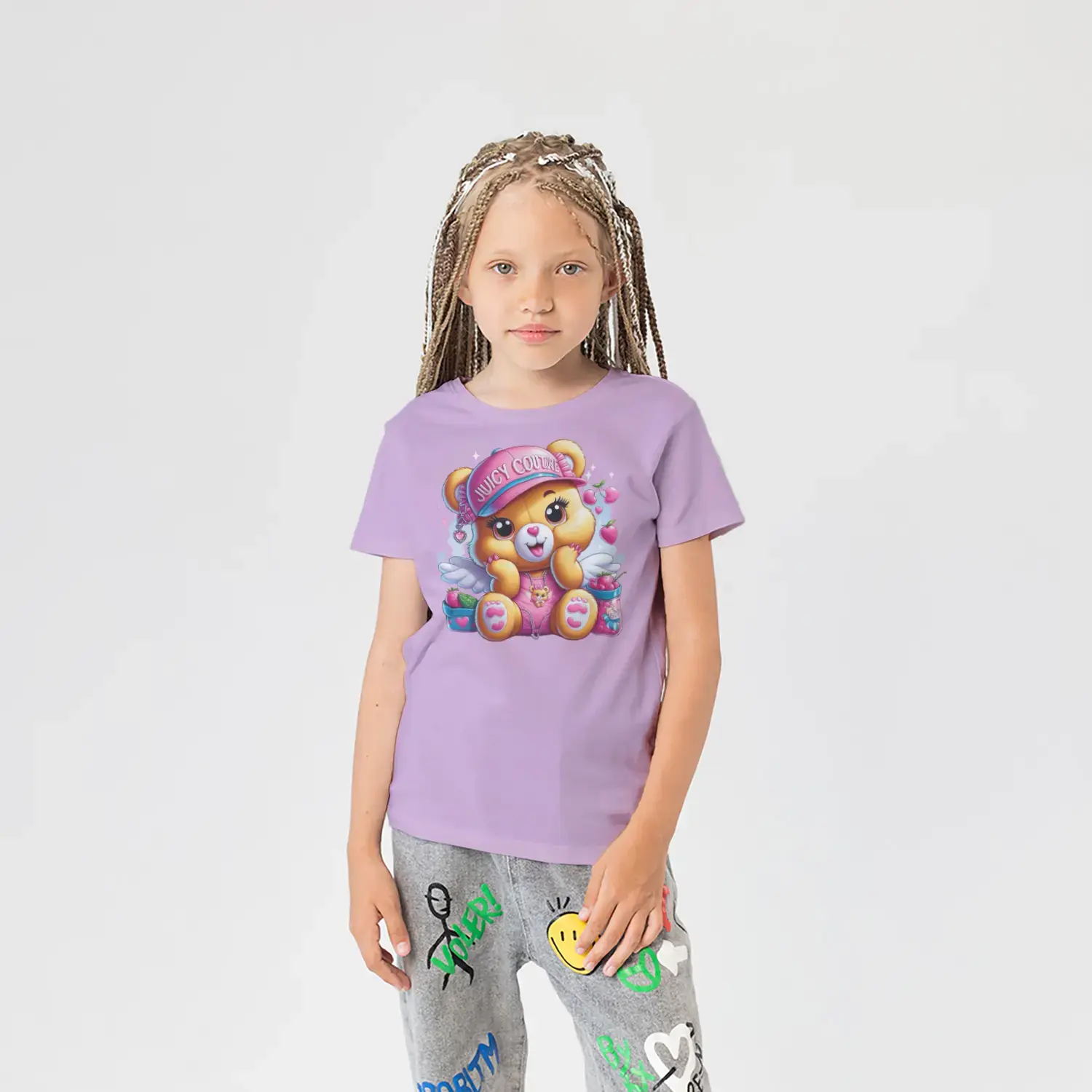 Pembe Şapkalı Tatlı Ayıcık Melek Kanatlı Baskılı Kız Çocuk Tişörtü