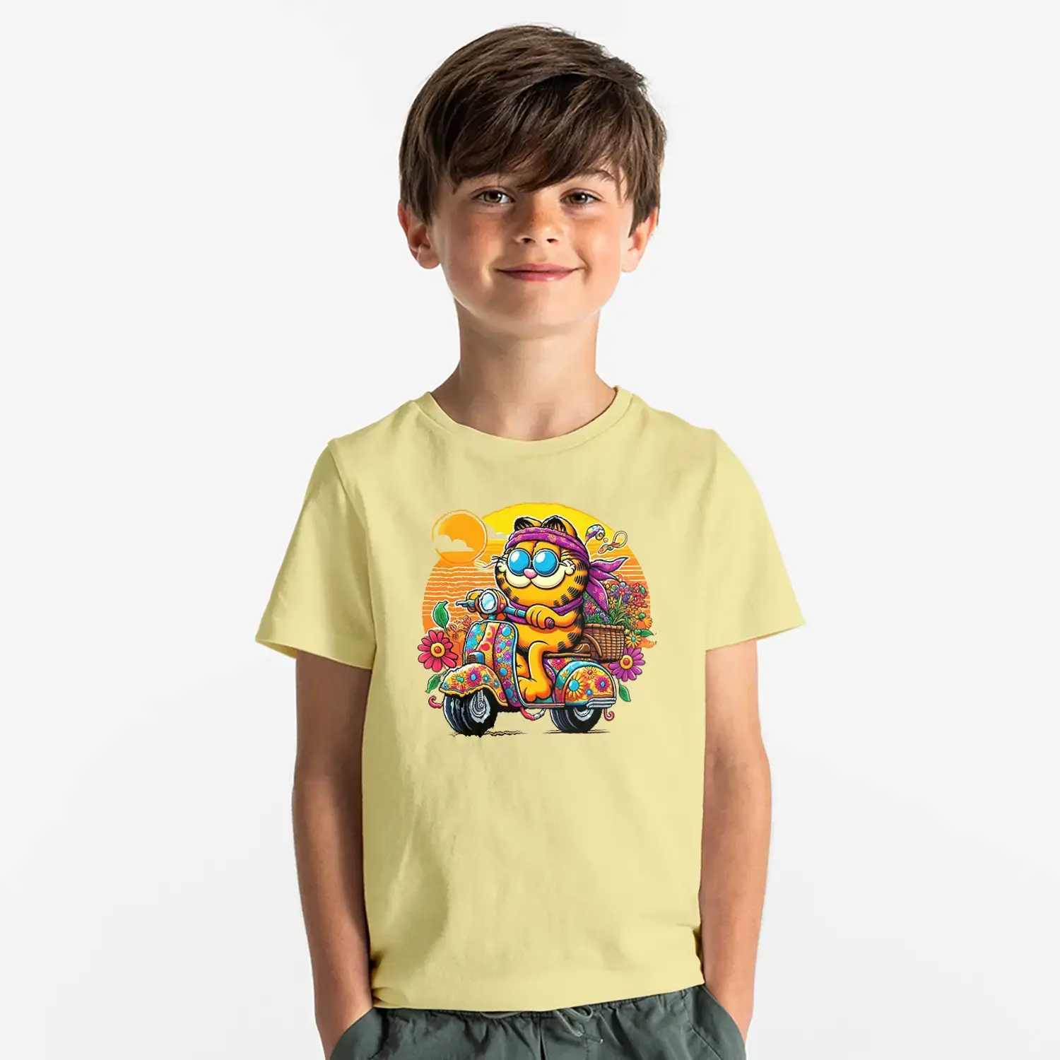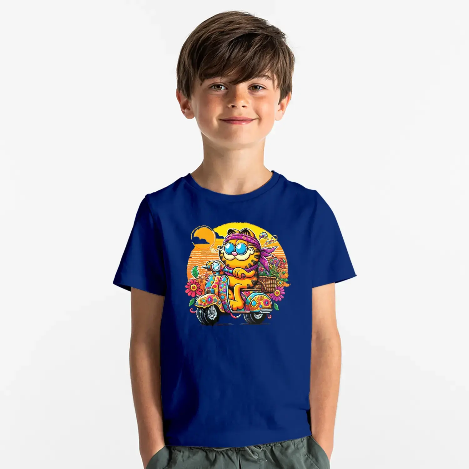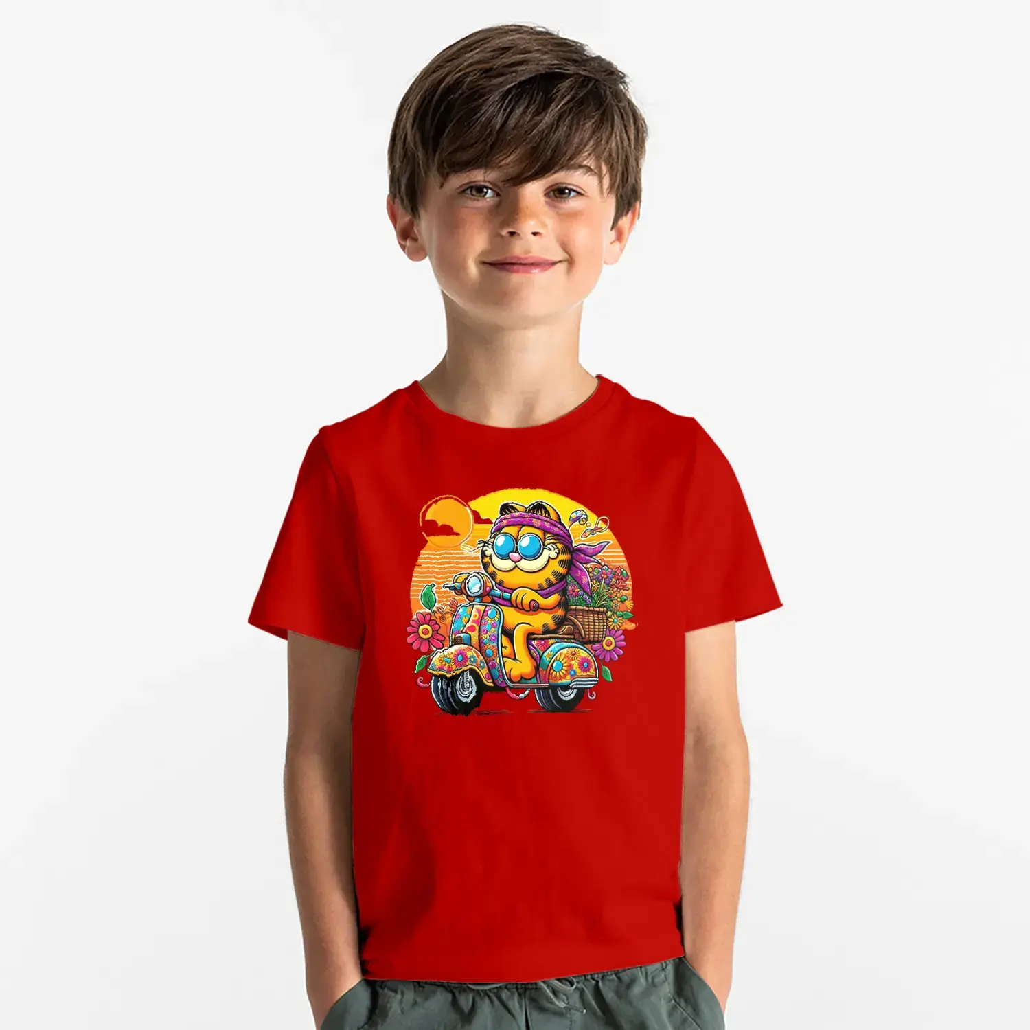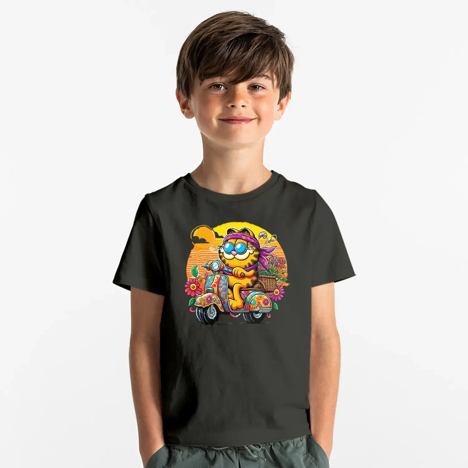 Scooter Süren Sevimli Kedi Çizgi Karakter Baskılı Erkek Çocuk Tişört