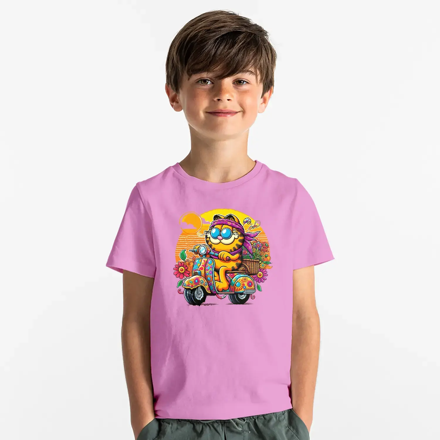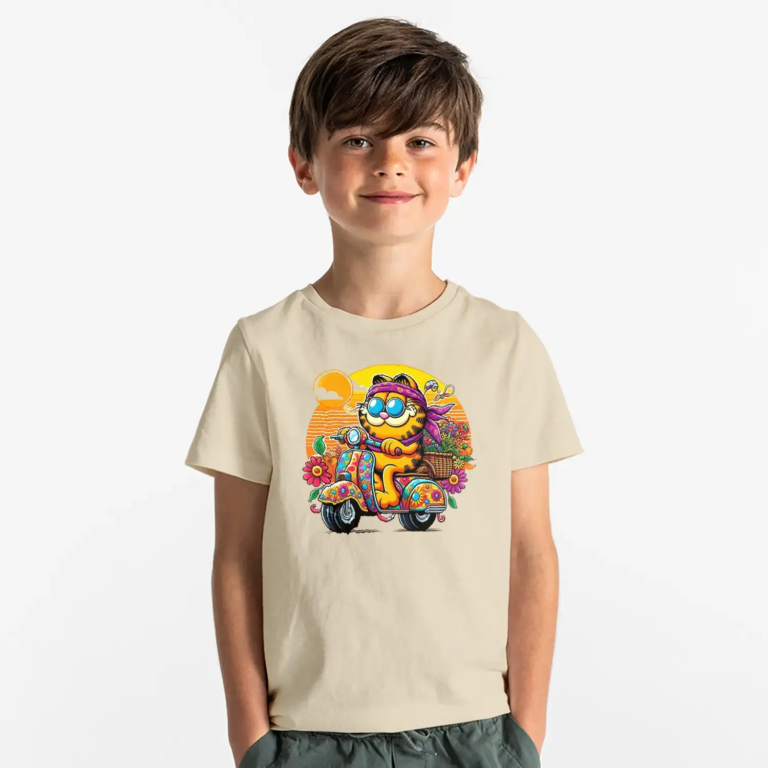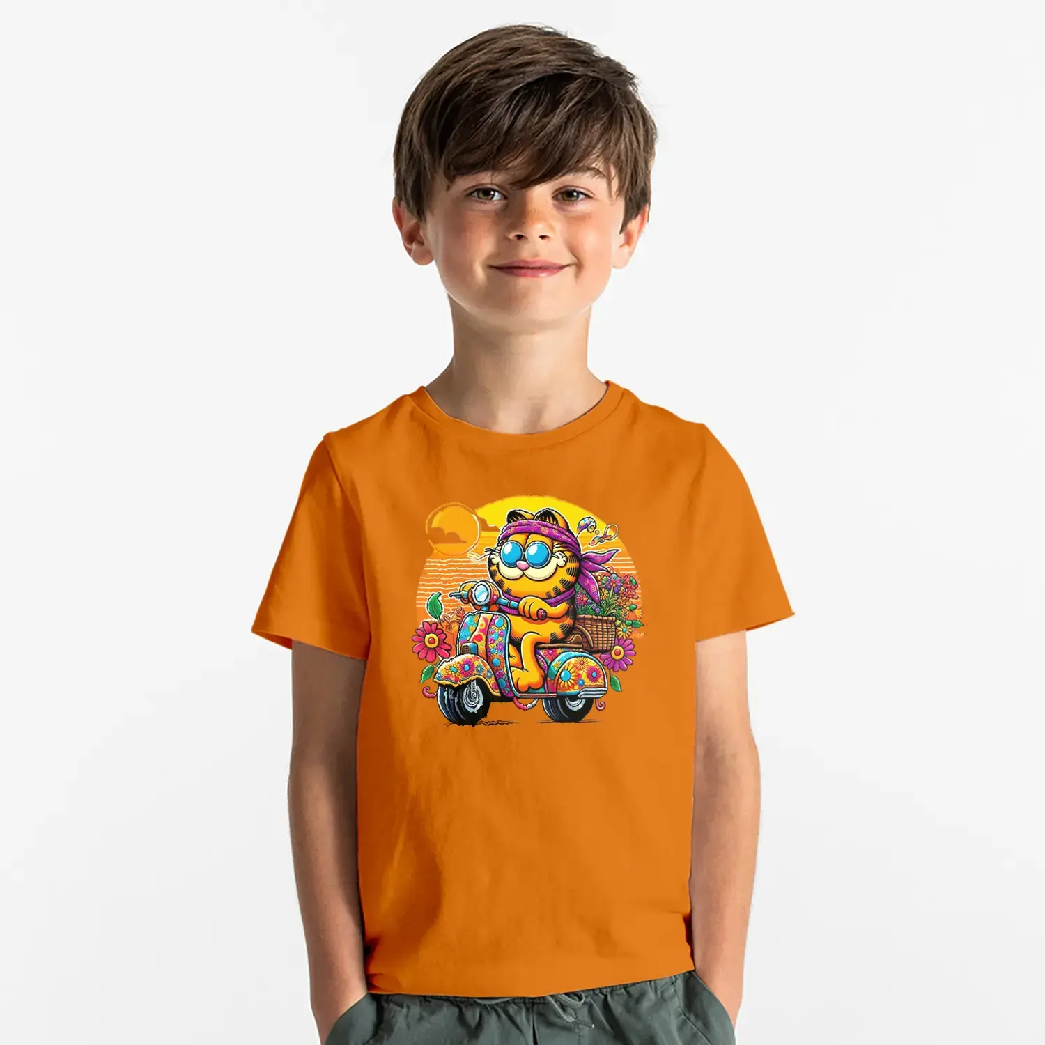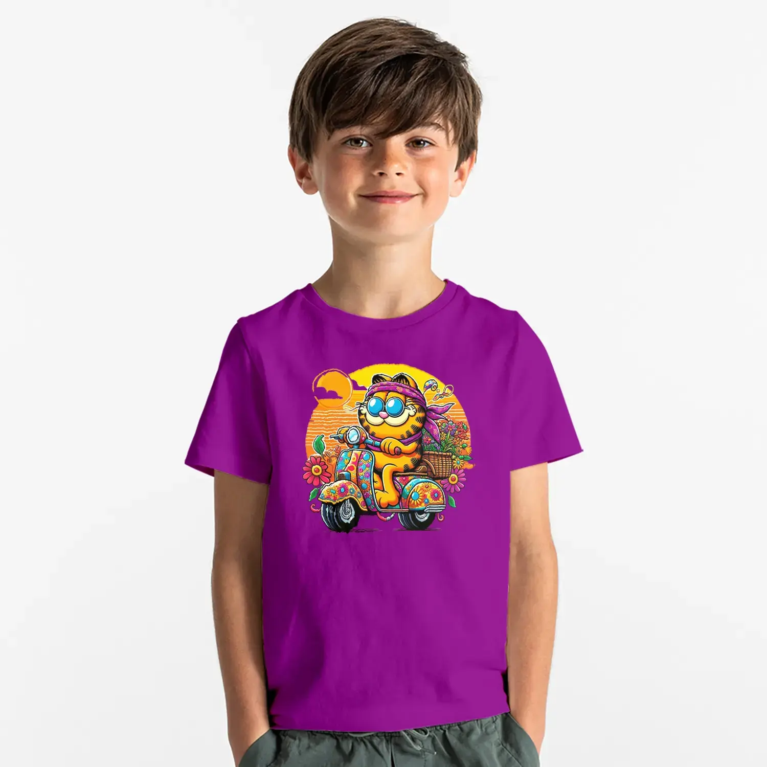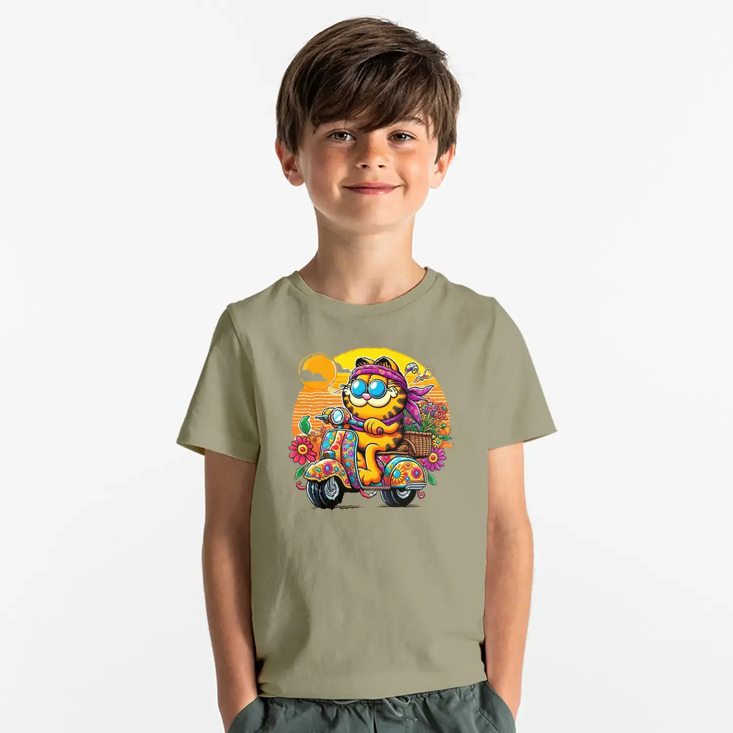 Scooter Süren Sevimli Kedi Çizgi Karakter Baskılı Erkek Çocuk Tişört