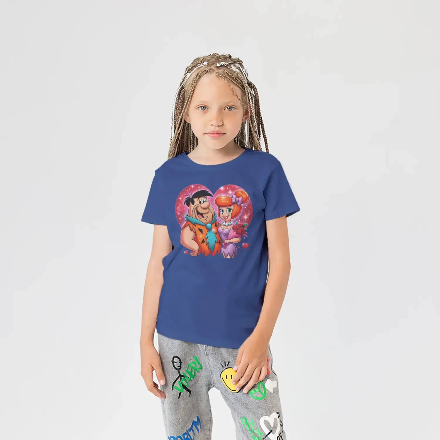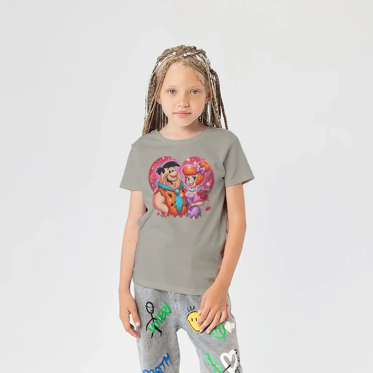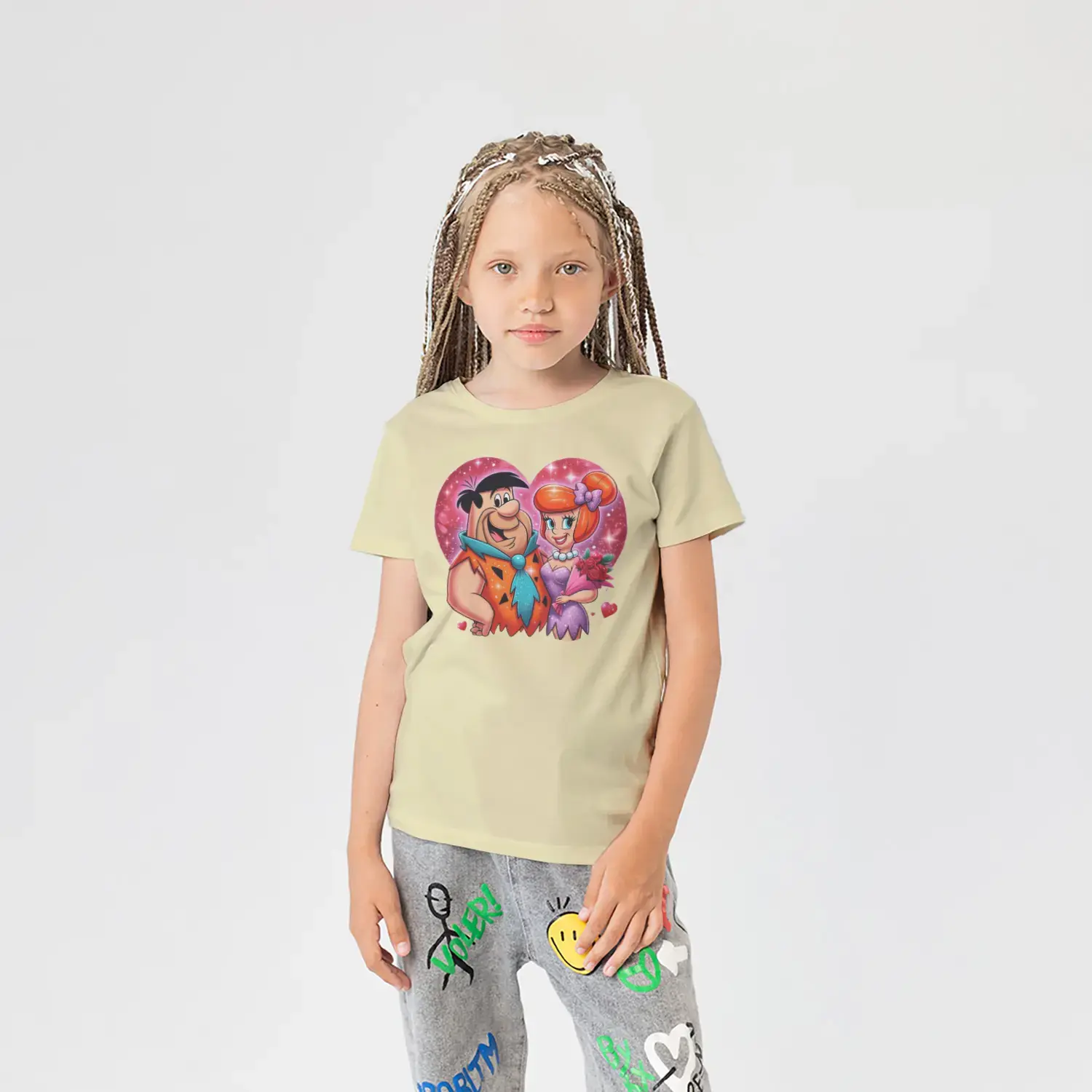 Taş Devri Çifti Kalp Çerçeveli Karikatür Baskılı Kız Çocuk Tişörtü
