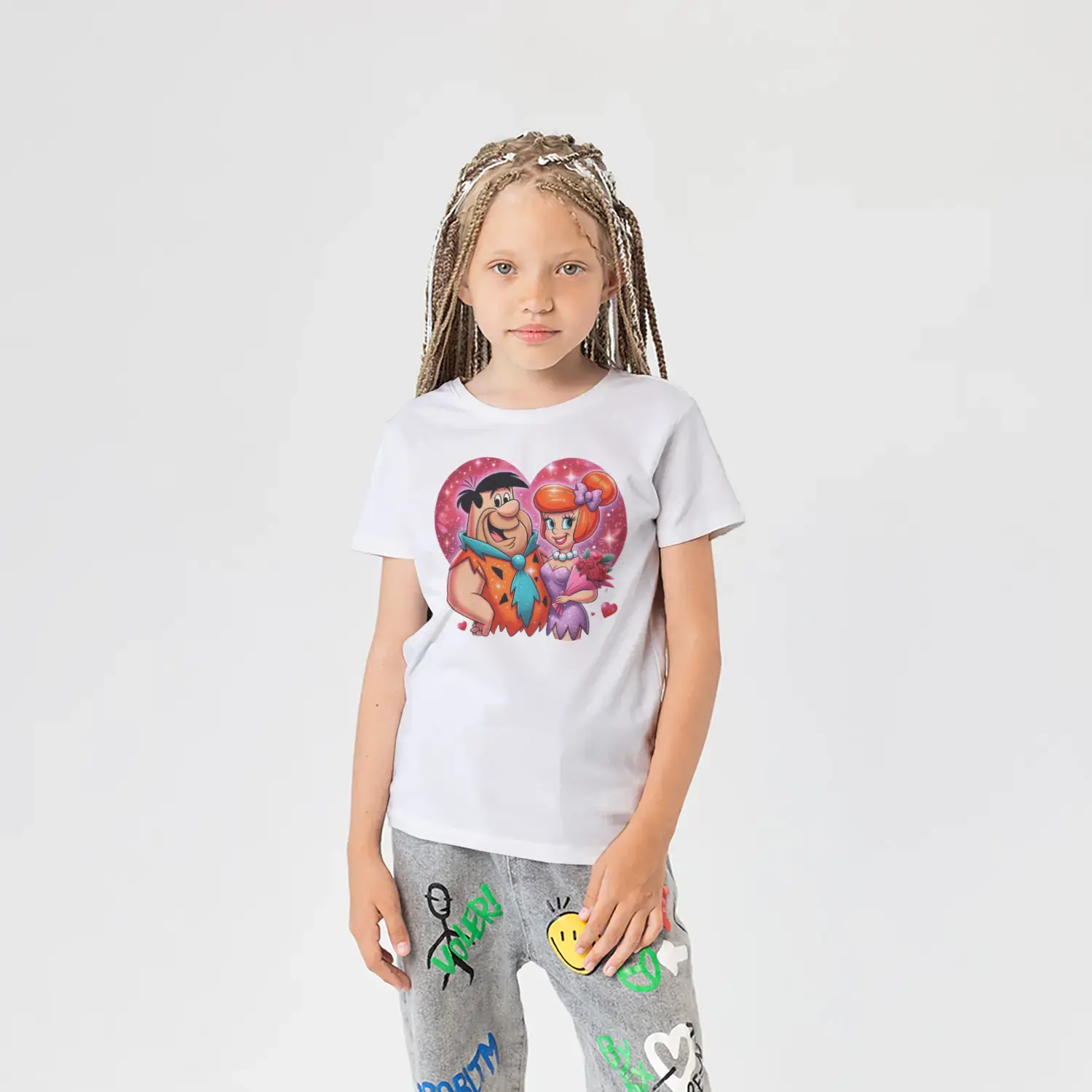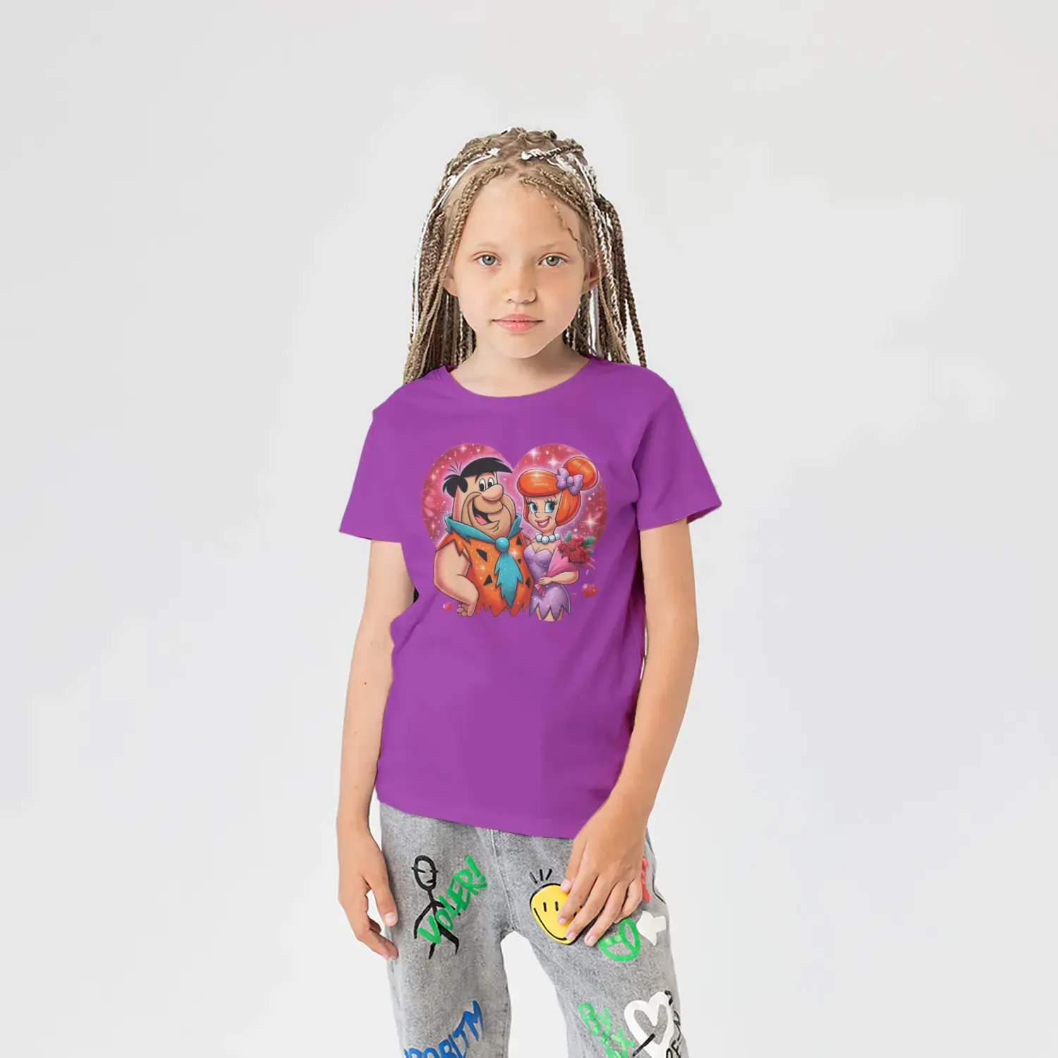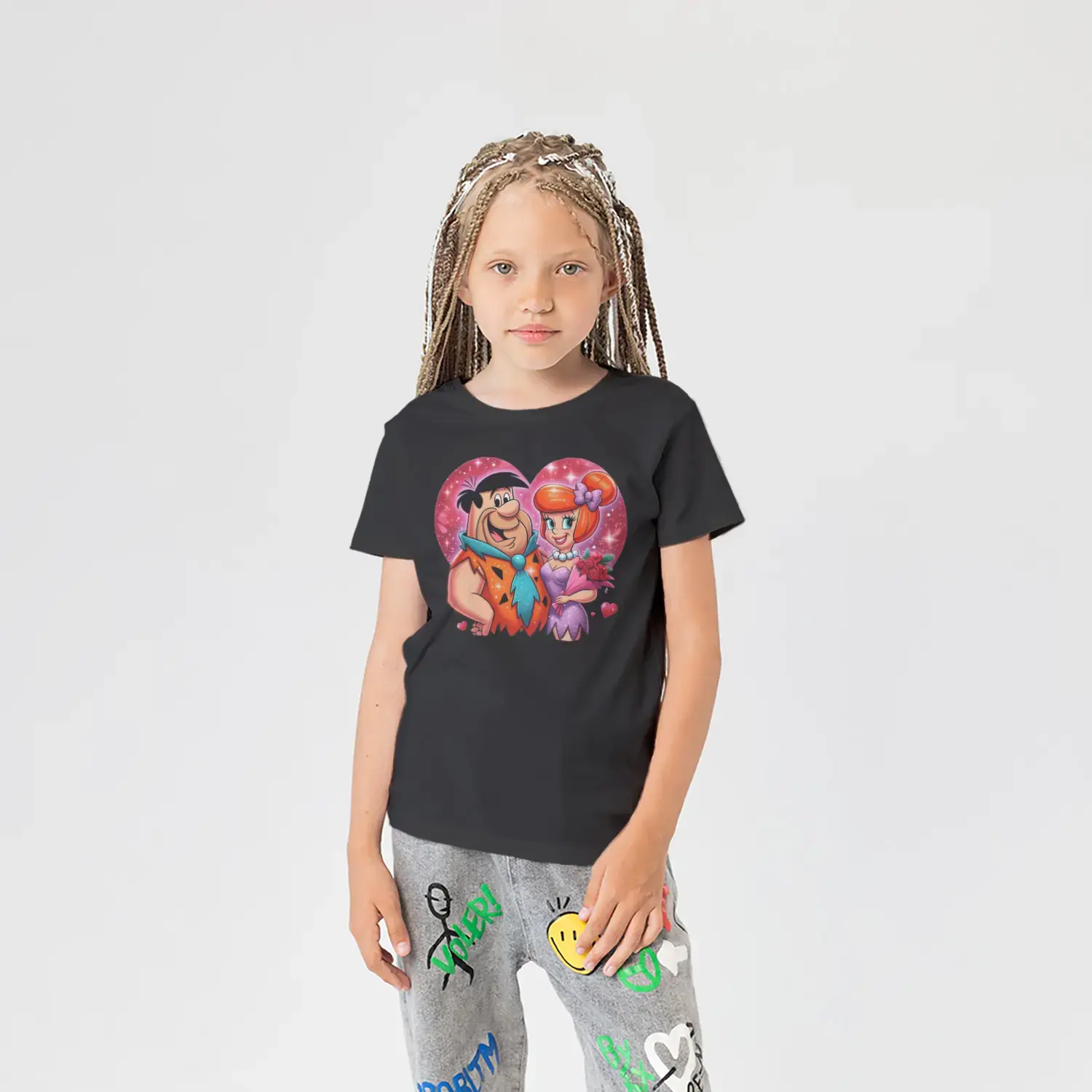 Taş Devri Çifti Kalp Çerçeveli Karikatür Baskılı Kız Çocuk Tişörtü