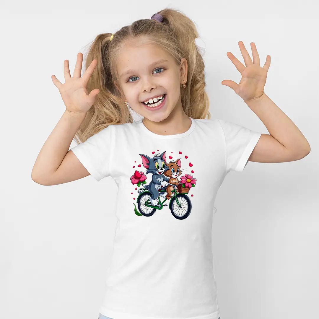 Tom ve Jerry Bisiklet Baskılı Kız Çocuk Tişörtü – Çiçekli Romantik Karikatür Desenli Çocuk T-Shirt