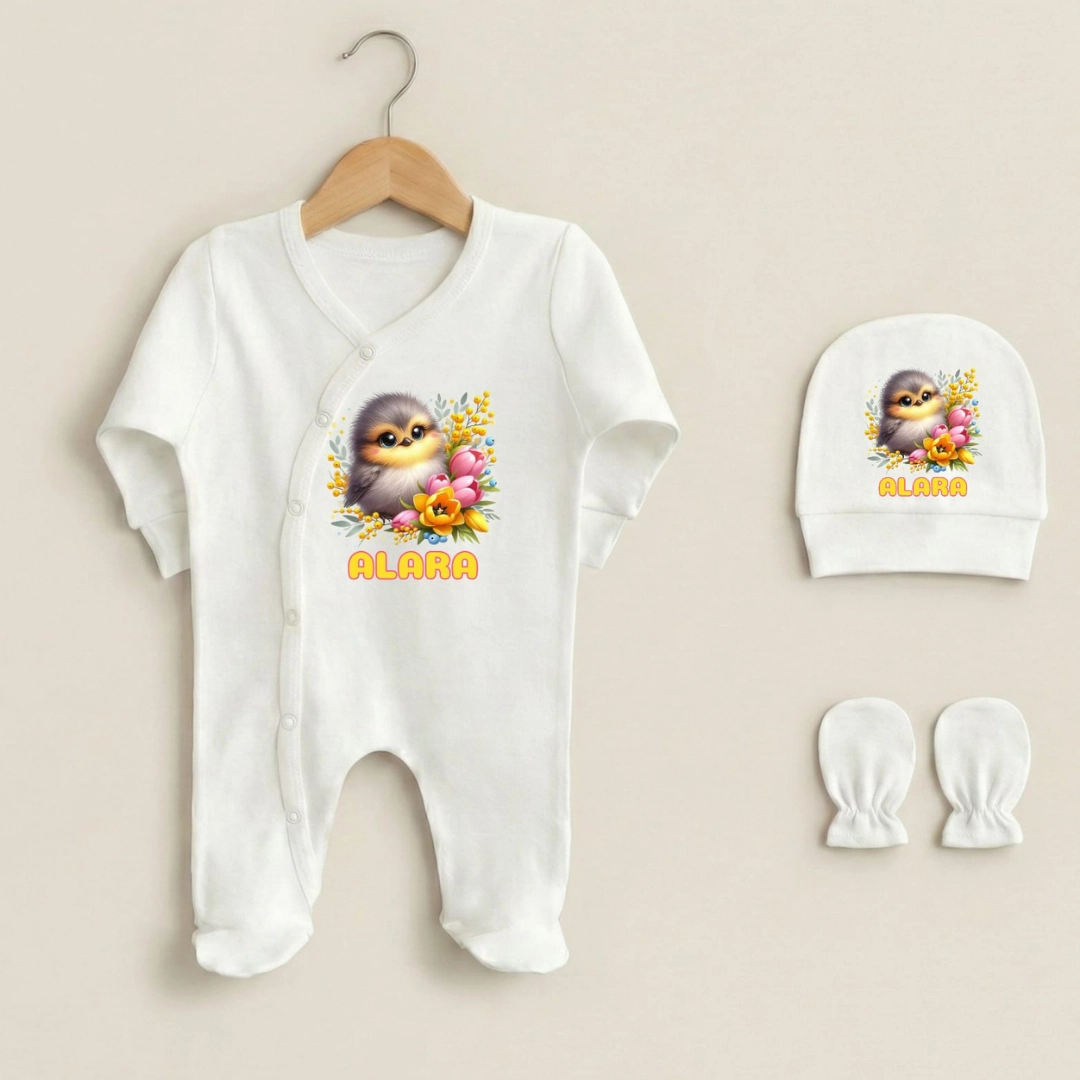 Üçlü Tulum Set Sevimli Kuş Baskılı Yenidoğan