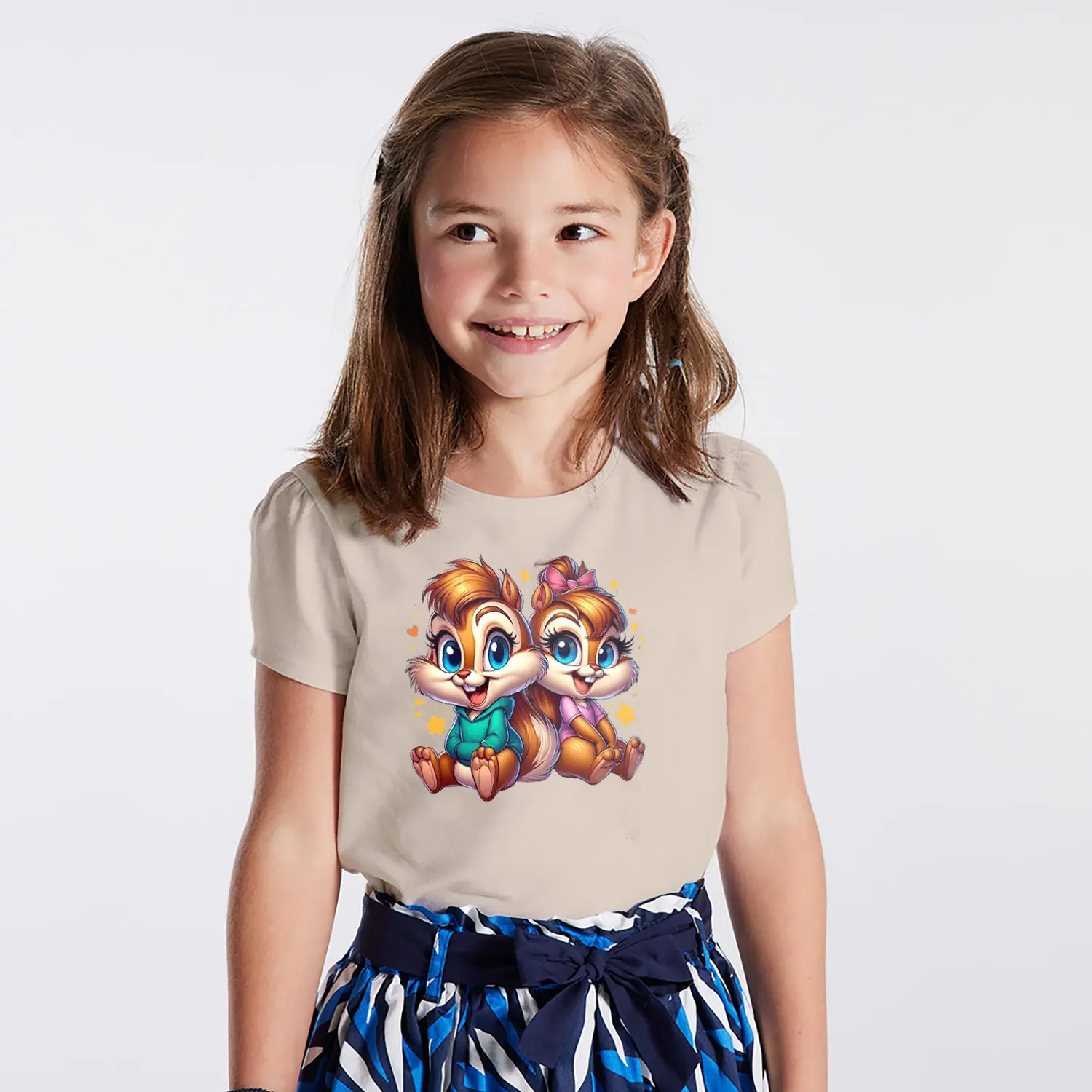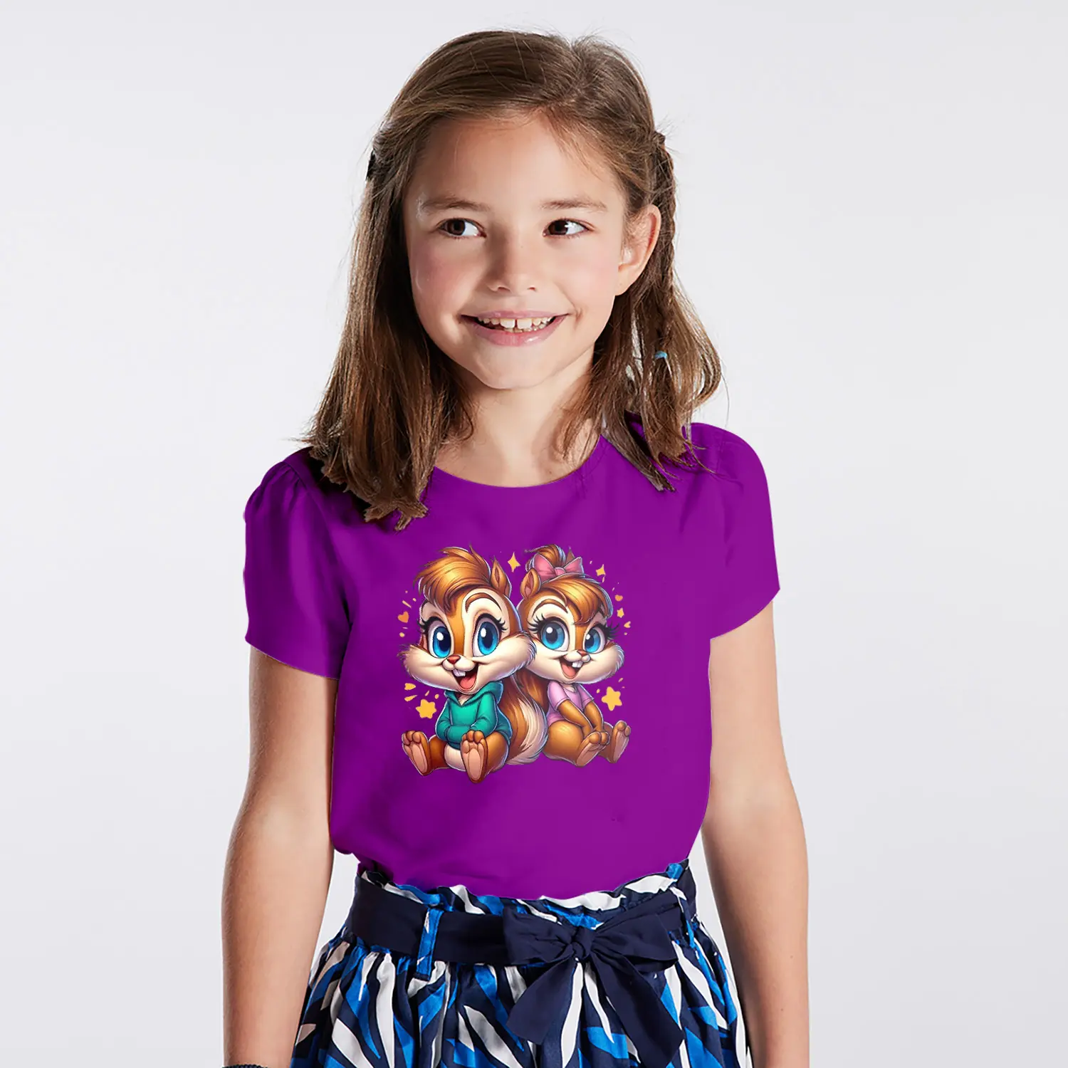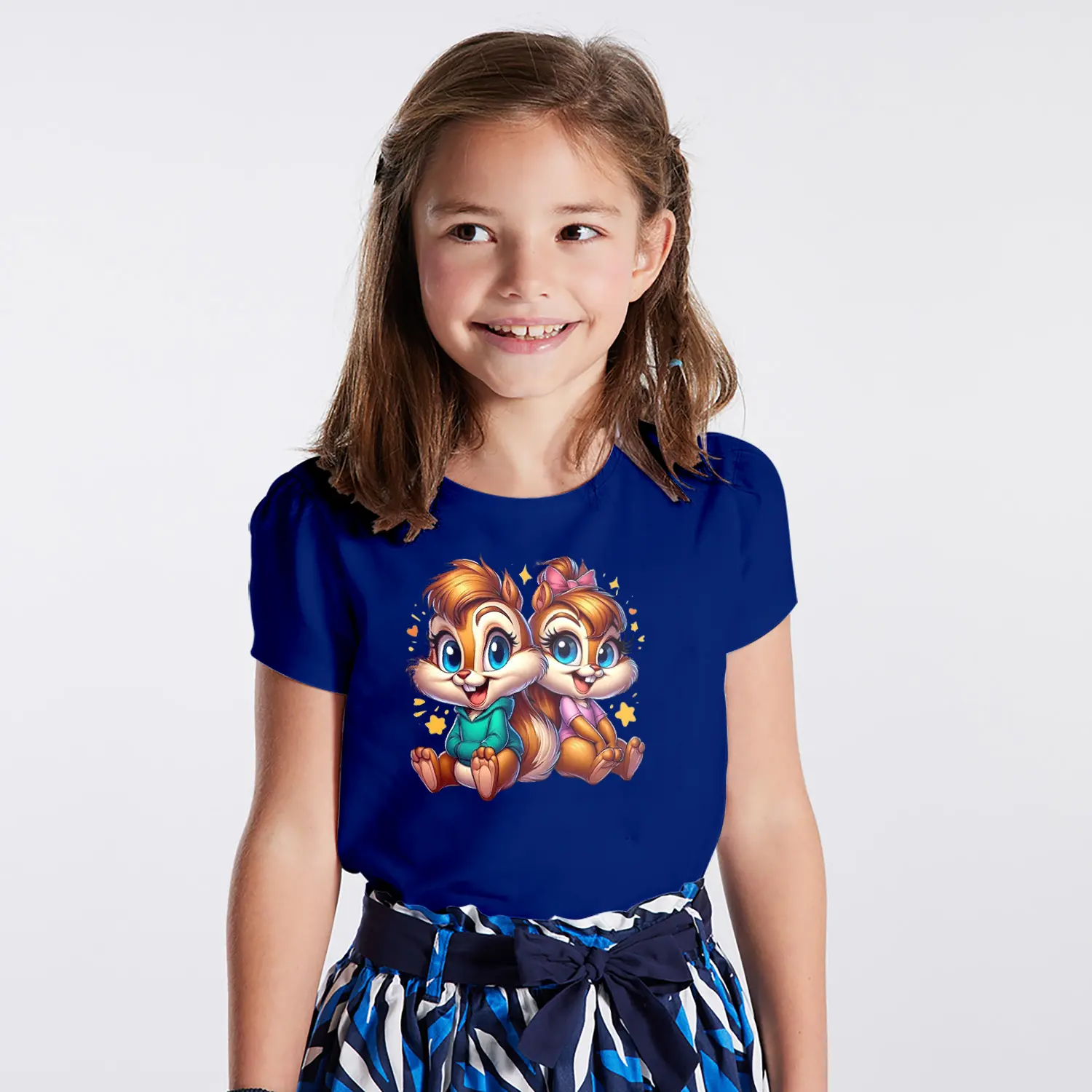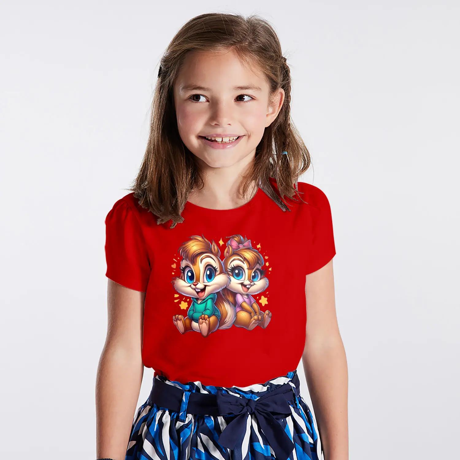 Yıldızlı Sevimli Sincap İkili Karikatür Figürlü Baskılı Kız Çocuk Tişörtü