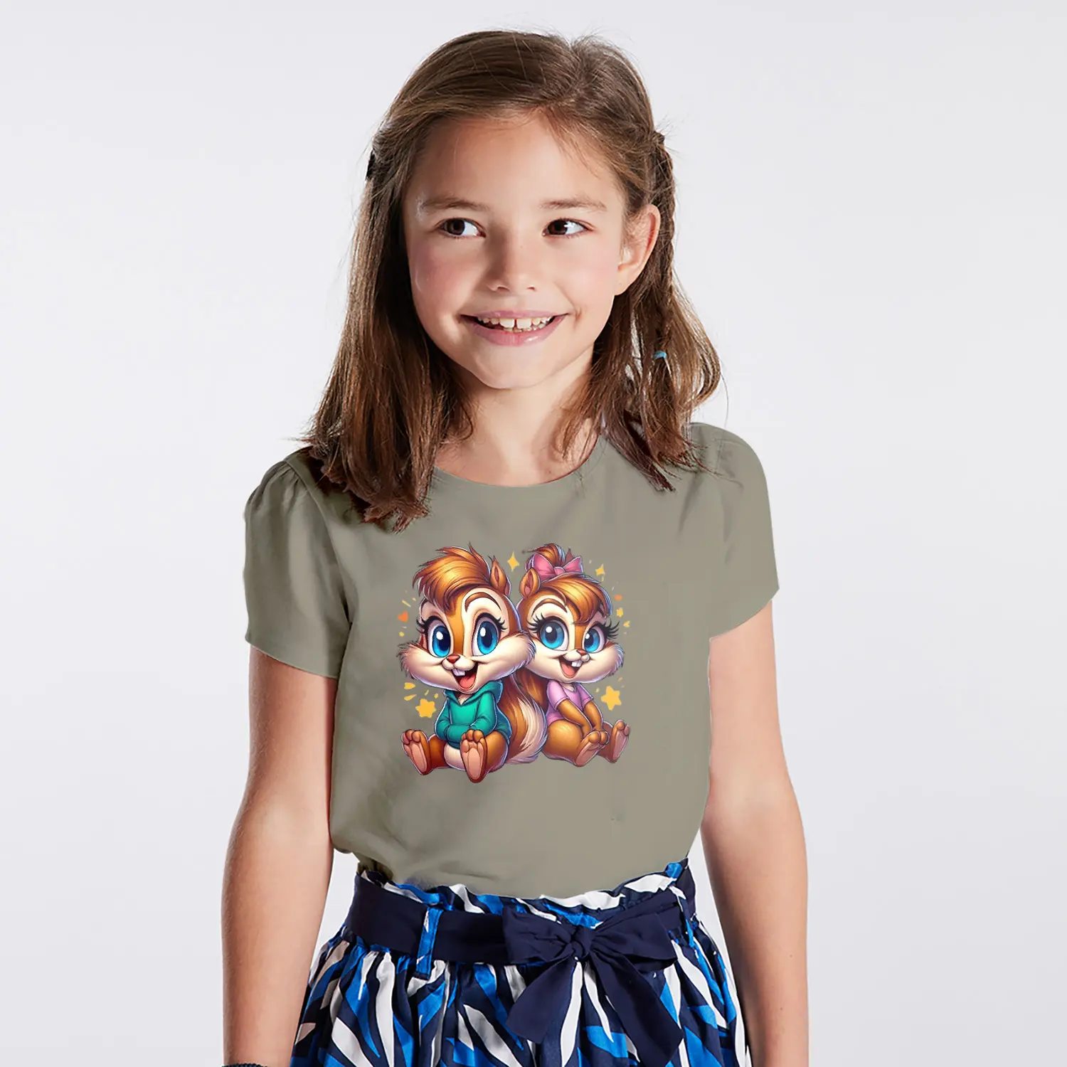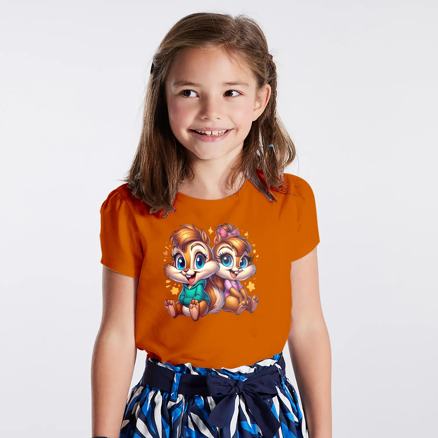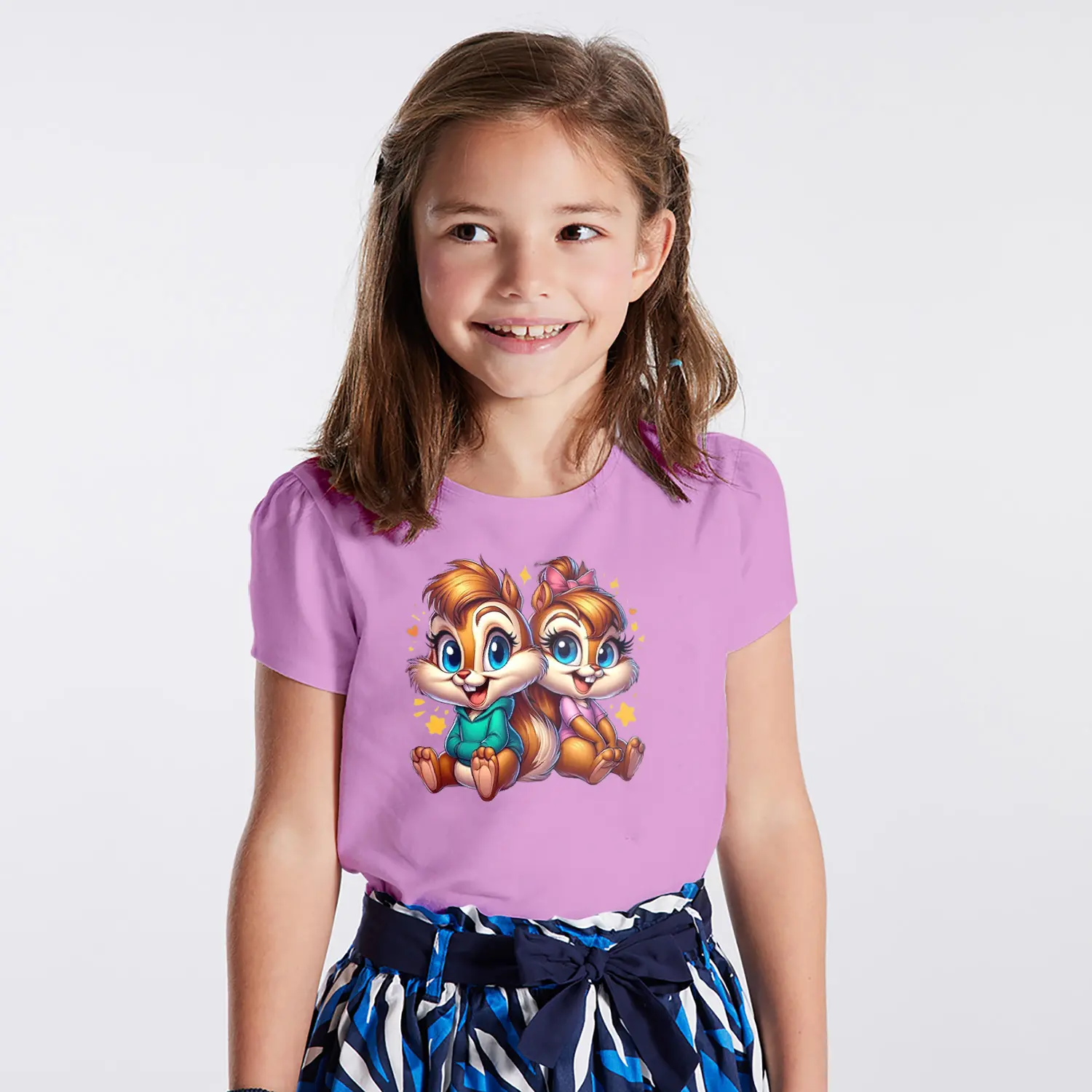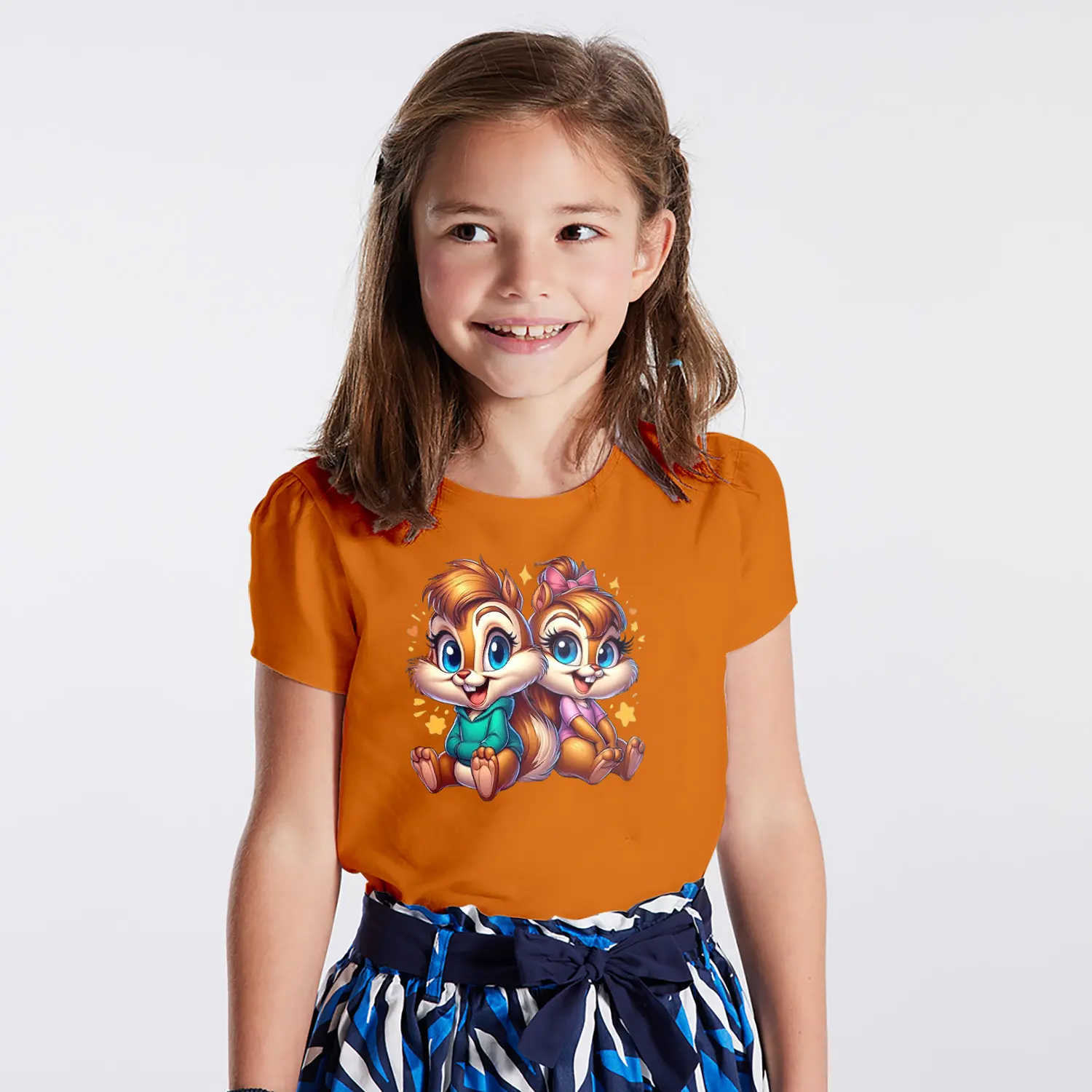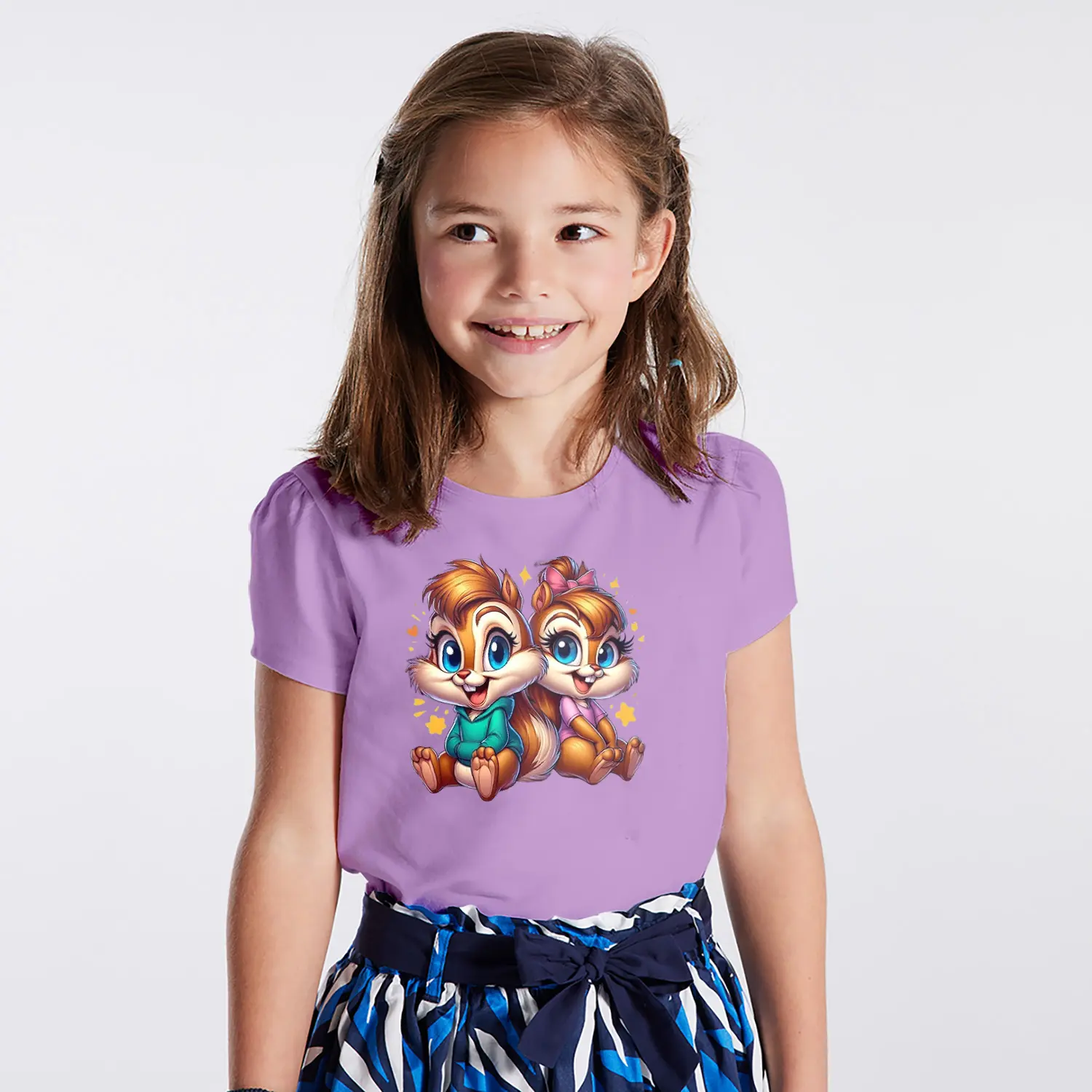 Yıldızlı Sevimli Sincap İkili Karikatür Figürlü Baskılı Kız Çocuk Tişörtü